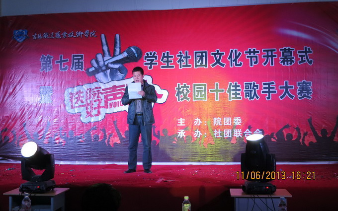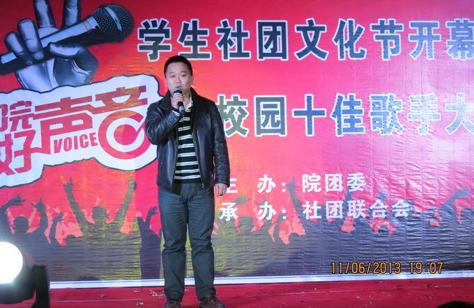 比赛开始之前,学院团委书记盛继前代表学院团委向本次社团文化节开幕式致辞。他指出在全团上下深入学习团的十七大精神,学院第二次团代会、学代会即将召开之际,我们举办学院第七届学生社团文化节开幕式,对学生社团来说是一件大事,对同学们来说是一件喜事。举办学生社团活动是学生开展文化活动、实现自我教育、自我管理、自我服务的重要渠道,是学院开展大学生思想政治教育、加强校园文化建设的重要阵地,是实现新时期“一体两翼”团建目标的重要载体。他指出,在学院领导的关怀、学院各相关部门的支持和同学们的辛苦努力下,我院学生社团必将沿着普及化、精品化、特色化的方向蓬勃发展,必将为学院校园文化的繁荣、学生综合素质的培养做出更大的贡献。