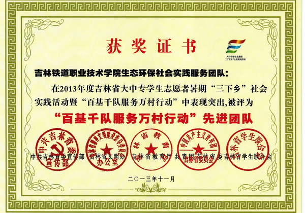 学院社团联合会生态环保社团荣获2013年度吉林省大中专学生志愿者暑期“三下乡”社会实践活动暨“百基千队服务万村行动”先进团队;铁道车辆系赴吉林市明智之家学校“帮帮团”实践组荣获2013年吉林省大中专学生志愿者暑期“三下乡”社会实践活动“优秀团队”;尹旺同学荣获2013年吉林省大中专学生志愿者暑期“三下乡”社会实践活动暨“百基千队服务万村行动”先进个人称号。