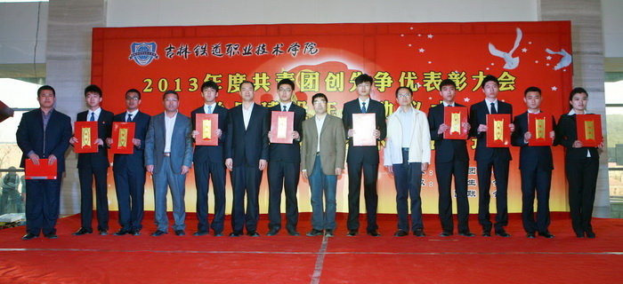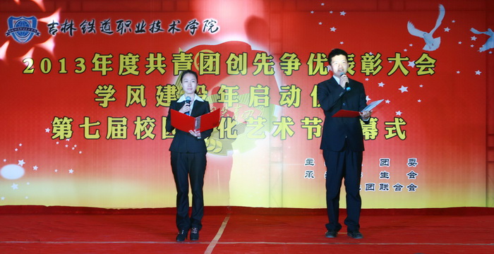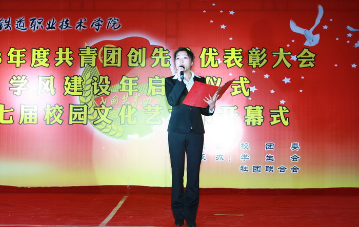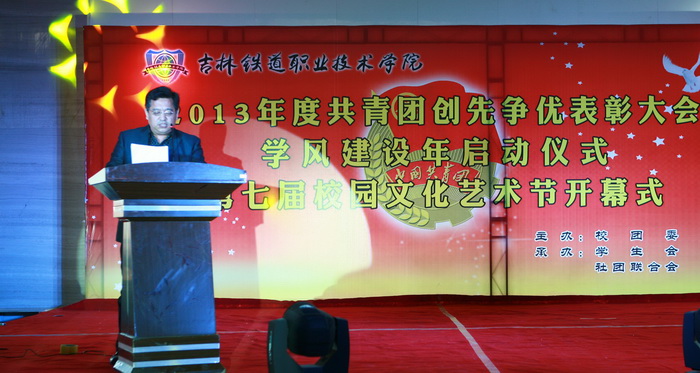 大会在雄壮的《国歌》声中拉开序幕。高鑫、耿浩然同学为大会献词的《铁院五月歌》将大会气氛推向了高潮。学生处长刘树全宣读了学院团委关于对在2013年度共青团工作、青年志愿者行动、科技创新和社会实践活动中的表现突出的先进集体和优秀个人的表彰决定。大会表彰了经济管理系团委和铁道工程系团委为“先进基层团委”;授予物流管理3121班团支部等32个团支部“先进团支部”称号,授予刘鸿瑞等241名团干部“优秀团干部”称号,授予李年顺等428名团员“优秀共青团员”称号,授予孙 博等448名同学“优秀志愿者”称号,授予付思千等414名同学“社会实践积极分子”称号。随后学院领导为获奖的先进集体和优秀个人颁奖。李欣同学代表受表彰的先进集体和个人发言。姜锐同学宣读了学风建设年倡议书。