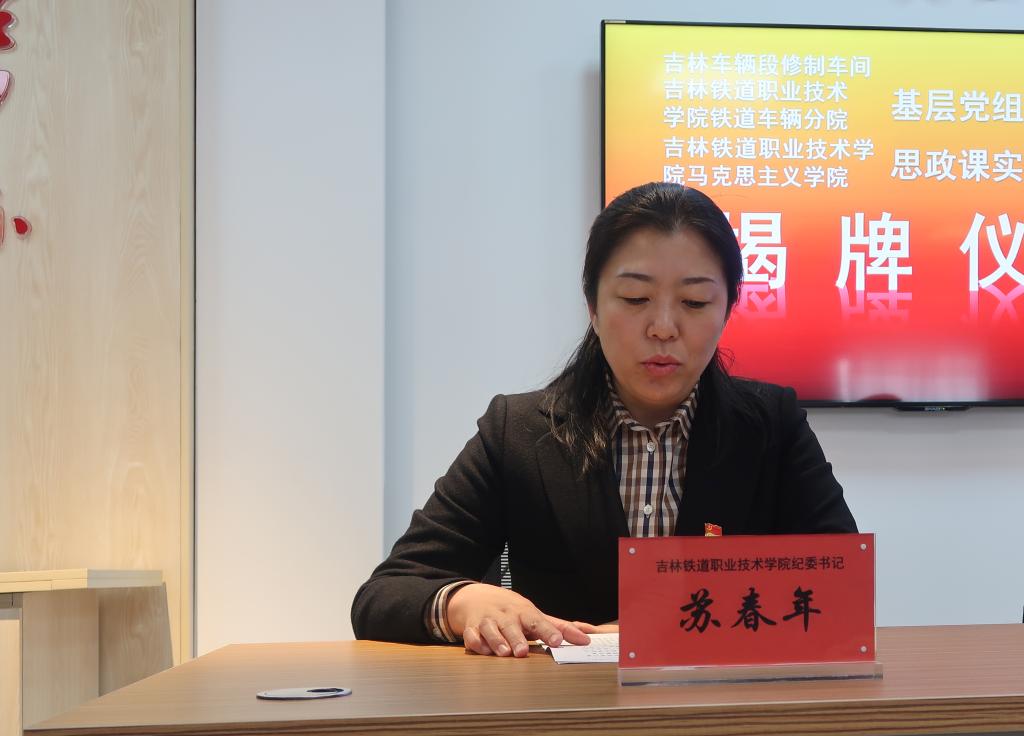 苏春年书记发表讲话。她代表吉铁院向吉林车辆段多年来对我院长时期、全方位、深层次的大力支持表示衷心的感谢。她指出,吉林车辆段与我校历来联系紧密,是吉林铁道职教集团重要的理事单位,在专任教师培养、学生教学实习、兼职教师队伍建设、实训条件优化等方面都给予了大力支持。我校很多毕业生在吉林车辆段的舞台上,通过站段的组织培养和师傅们的精心引领,成为技术和管理的骨干。吉铁院和吉林车辆段校企之间通过基层党组织共建推动党建工作,是新时期高校党建和企业党建联创的一项有益探索,是完善职业教育培训体系,深化产教融合、校企深度合作的创新模式,更是坚持党管人才,落实立德树人根本任务,培养德智体美全面发展的社会主义建设者和接班人的重要举措。预祝校企双方交流更广泛,合作更密切,前景更美好!