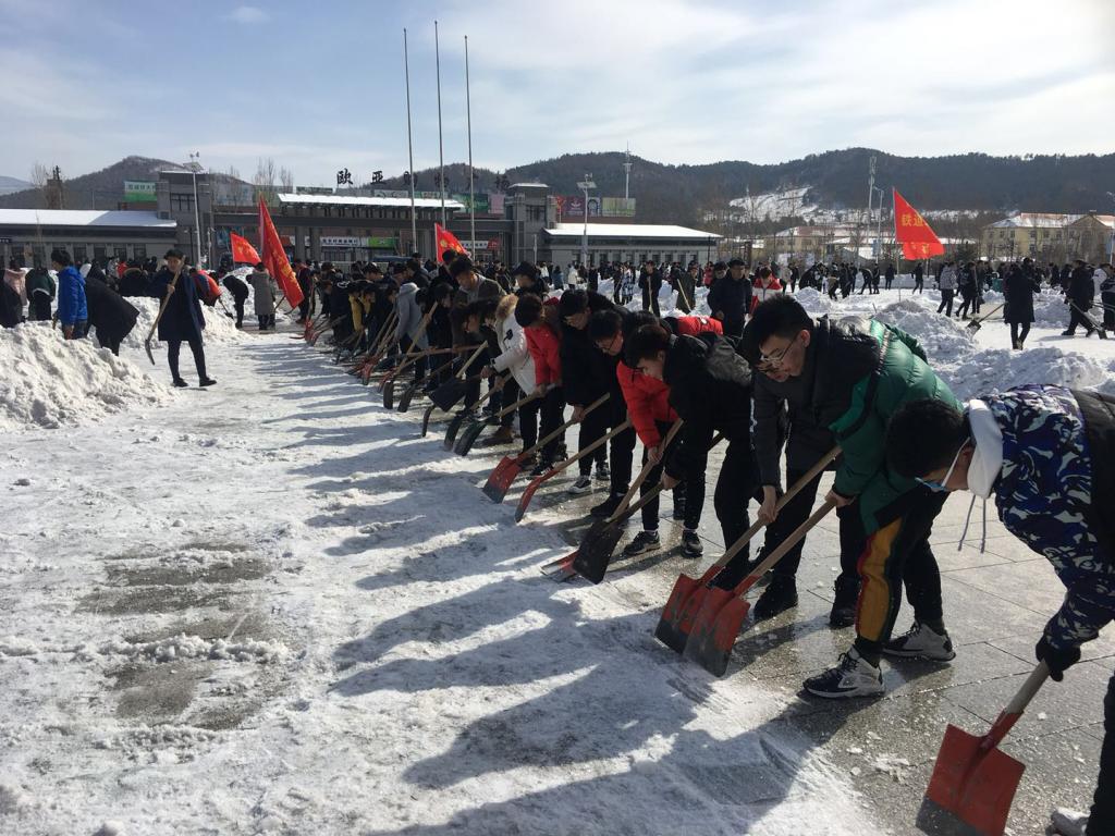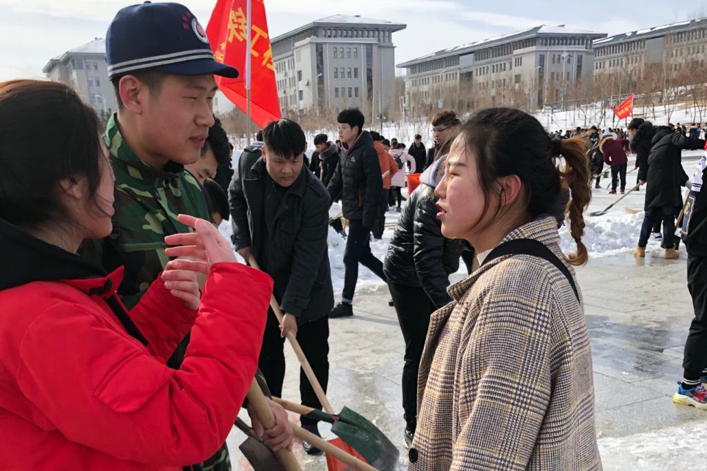 天气寒冷,但寒风阻挡不了学生干部们志愿服务的热情;工具有限,学生就自动分为两组,前面同学干到没有力气了,第二组学生马上接替他的工作。学生轮番清理,干劲十足,在大家齐心协力的配合下,完成了学校布置的清雪、清冰任务。