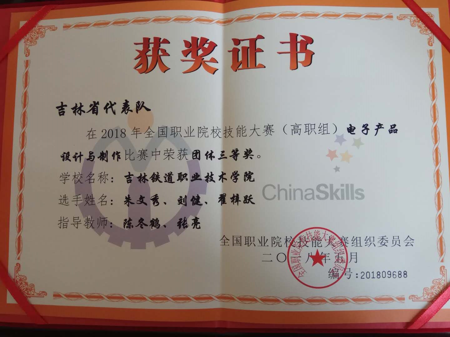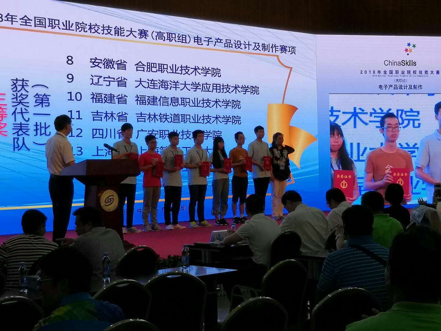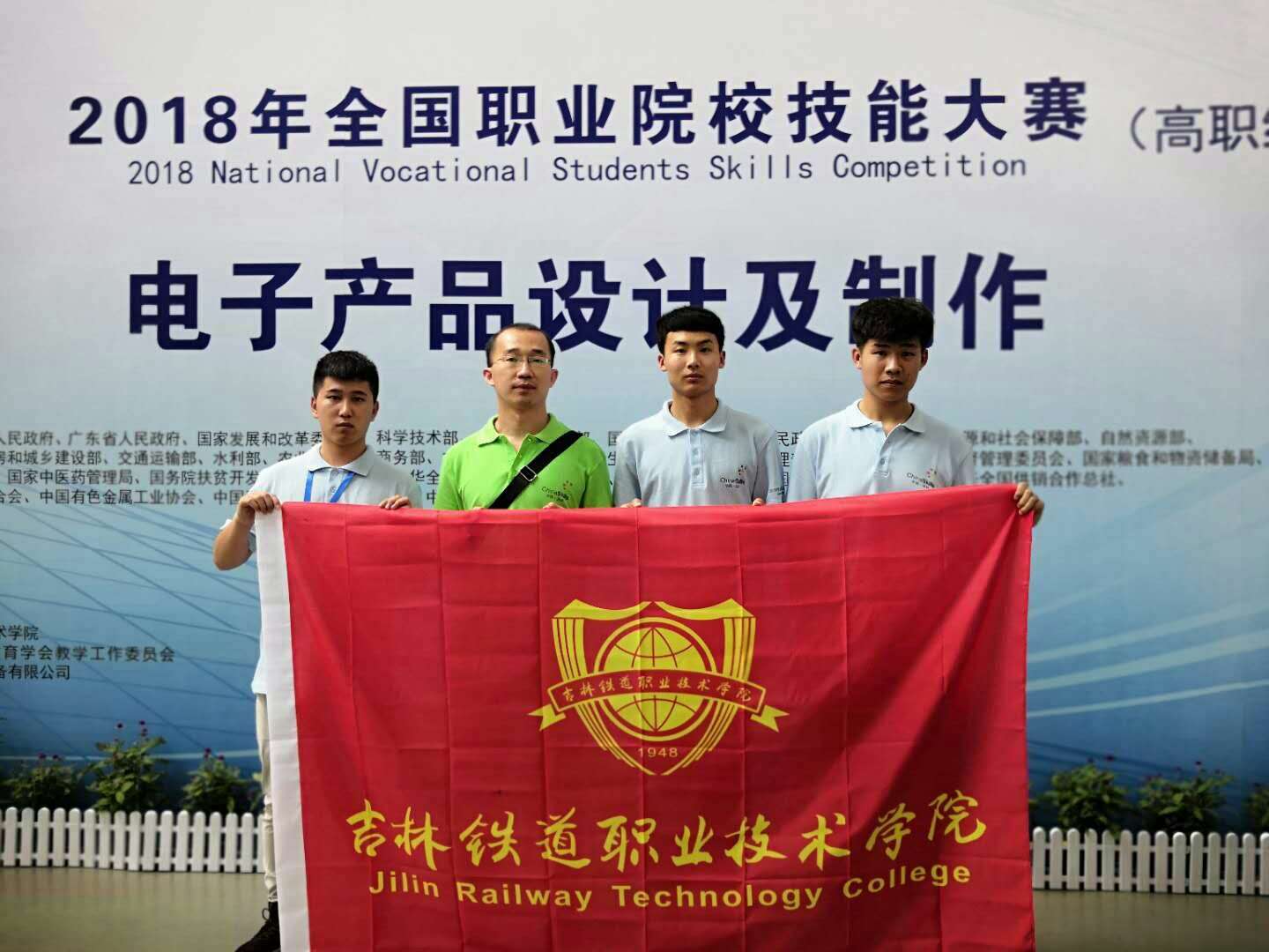 2018年全国职业院校技能大赛(高职组)电子产品设计与制作赛项由教育部、科技部、工信部等36个部委主办,广东省教育厅和深圳市人民政府承,5月23日—24日在深圳信息职业技术学院举行。来自全国28个省市,共69支高校代表队的207名选手参加此次大赛。经过8个小时的激烈角逐,我校电气工程学院学生刘健、朱文秀、翟梓跃在陈冬鹤、张亮老师指导下代表吉林省队在电子产品设计及制作比赛项目中荣获国家三等奖。