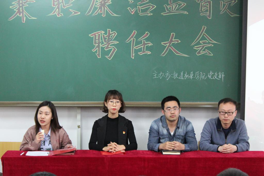 为贯彻落实学院党的建设暨党风廉政建设工作会议精神,深入推进我院党风廉政建设工作,提高铁道机车学院学生廉洁意识,加大廉洁监督力度,强化学生行为规范,营造清明的校园环境。5月10日下午,铁道机车分院在教学楼西301阶梯教室召开兼职廉洁监督员聘任大会。铁道机车分院学办主任曹煜、团委书记王蒙、辅导员周峰好、宫汝航、学生党员、全体学生会干部、部分学生代表以及受聘的兼职廉洁监督员参加本次会议,会议由宫汝航主持。