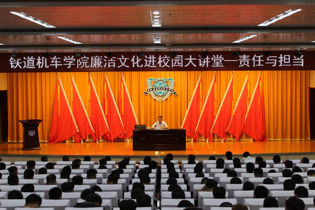 为深入贯彻学习党的十九大精神,全面从严治党,加强廉政教育,结合我院工作实际,进一步落实铁道机车学院“廉洁文化进校园,机车牵引送清风”活动。5月16日,铁道机车分院在图书馆报告厅开展“廉洁文化进校园”大讲堂,以“责任与担当”为主题,特邀吉林机务段纪委副书记宋福昌主讲。吉铁院纪委副书记、纪检监察处处长侯占峰,纪检监察处纪检员王亚明,铁道机车学院全体党员以及1、2年级学生代表参加了本次讲座,讲座由学办主任曹煜主持。