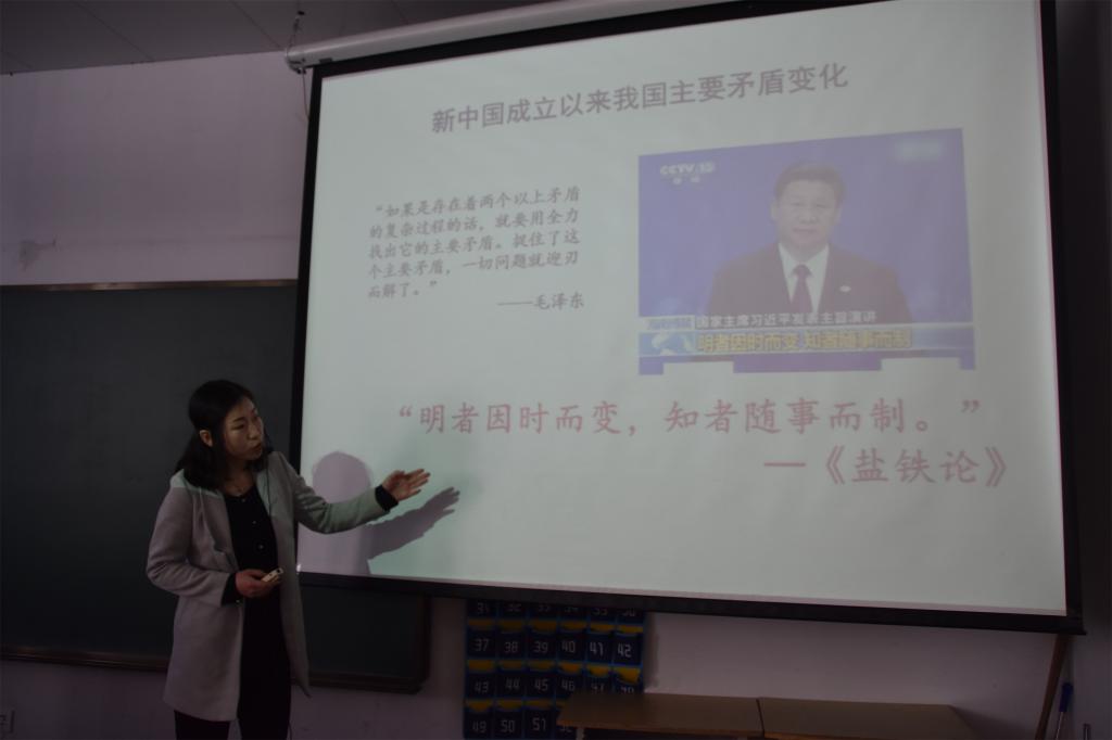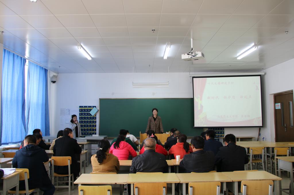 按照学院党委关于认真学习党的十九大精神的要求,铁道工程分院通过一系列宣传和教育学习活动,切实将党的十九大精神贯彻落实到广大师生当中。4月18日下午在教学楼209教室,总支邀请了马克思主义学院蔡丽梅老师为分院全体党员师生做题为“新时代 新矛盾 新起点”主题党课。参加本次党课学习的还有与我分院党团共建基地的洋草沟村党支部全体党员干部。