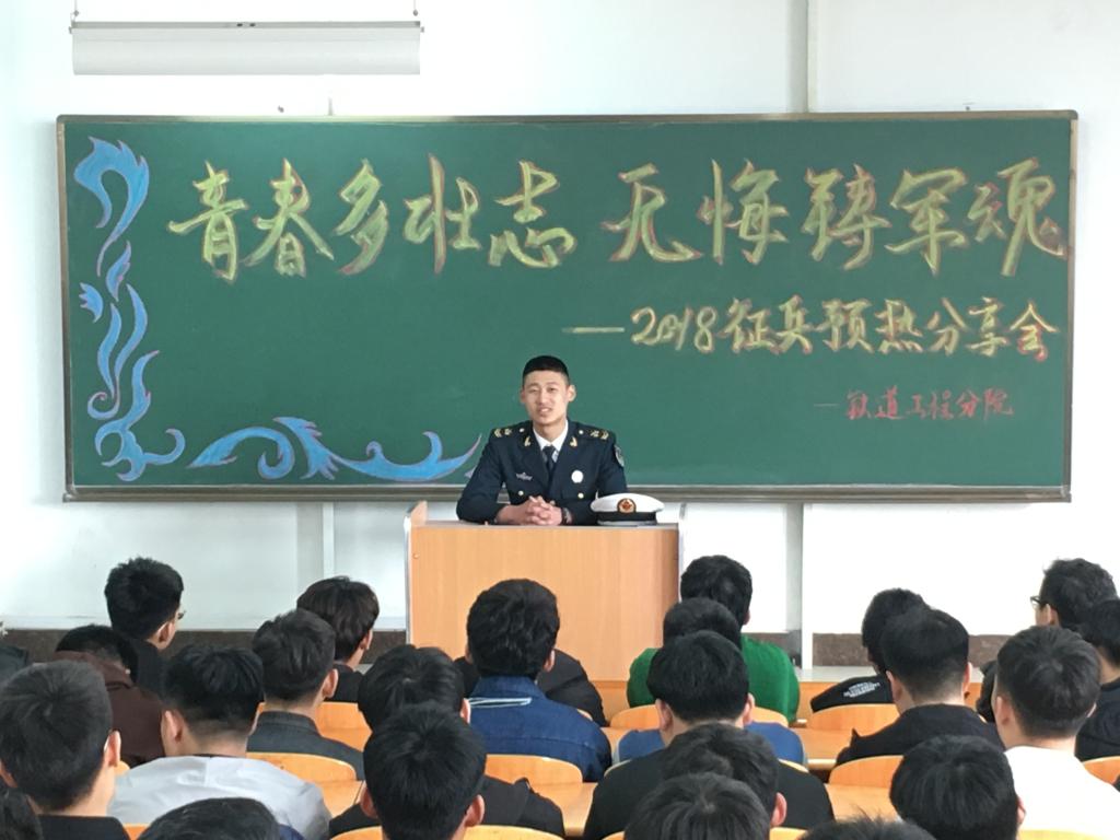 又到一年征兵季,优秀青年齐聚集,志在四方好男儿,心有梦想参军去。大学生应征入伍是提高兵源质量,促进国防现代化,推动军队科学发展,提高大学生全面素质的战略使命。为切实做好2018年学院征兵工作,铁道工程分院邀请现任中国人民解放军海军北海舰队旅顺基地参谋部警卫侦察连警卫纠察班班长王泽丞上等兵于4月7日在阶梯西201教室作题为“青春多壮志,无悔铸军魂”征兵预热动员会,分院全体在校男同学参加会议。会议由分院学办主任于鹏主持。