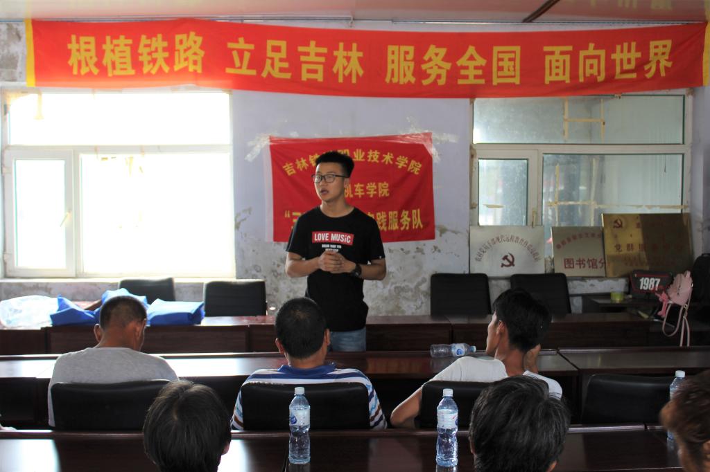 活动的开始,由铁道机车团委组织部部长张天阳为村庄居民讲述中国铁路近年来的发展前景和铁路方面的相关专业知识。随后,由铁道机车服务实践团队同乡村书记及村长进行密切交谈,表示要继续加强党团文化建设 ,用党的光辉照耀未来的希望,以传习所为重要发展目标。阅读招生简章和网络视角,了解我校历史及发展。并由实践服务团队向乡村居民发放书籍及日常生活用品。