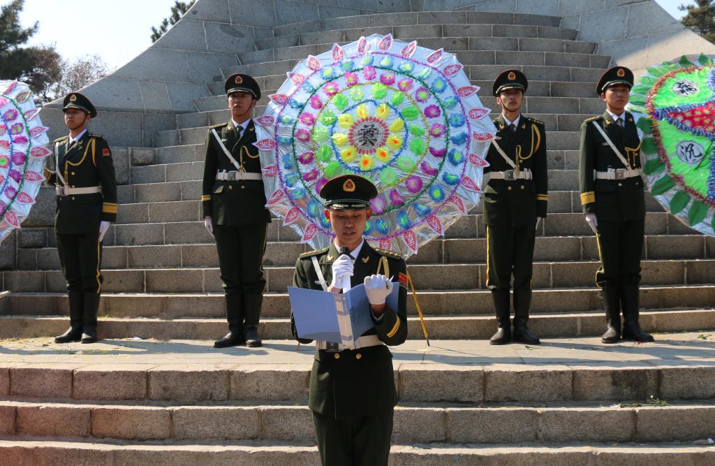活动伊始,学院国旗护卫队成员在革命烈士纪念碑前敬献花圈,全体成员为革命烈士们默哀一分钟,以此表达对革命烈士的悼念和无限追思。