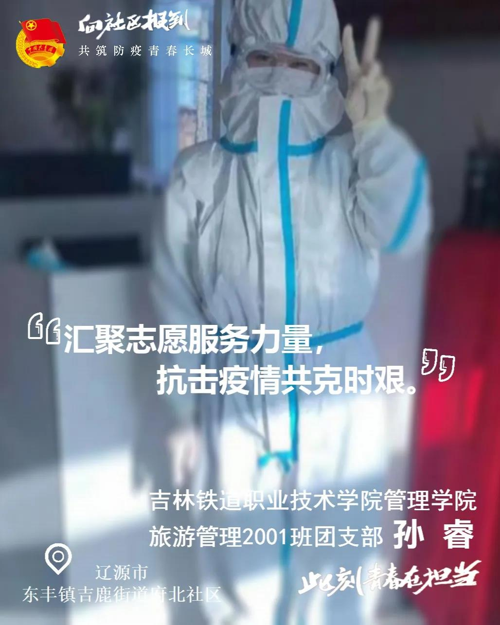 孙睿是旅游管理专业2020级的学生。她说:“在疫情面前,作为共青团的一员,有责任和义务做一些力所能及的事,为赢得抗击疫情战斗的胜利贡献自己的一份力量!”在志愿服务期间,她主要的工作是卡点测体温、秩序维护、扫吉祥码、在各小区宣传惠民政策与发放口罩等工作。她用实际行动展示出新时代青年的勇敢与坚强、责任担当,为家乡疫情防控工作贡献了青春力量。