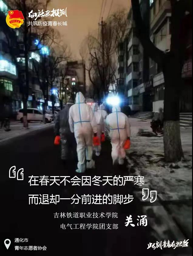 关涌身为一名共青团员,在通化市疫情发生不久,便毅然决然地参加通化市青年志愿者协会组织的防疫志愿者活动。在社区,他参与一线防疫活动中,主要负责维持居民核酸检测的秩序,对有密接和次密接居民楼道进行消毒工作,为居家隔离的居民送菜倒垃圾。他说自己的工作很平凡,虽然每天工作长达八个小时很辛苦,但是他也从来没有抱怨,因为他知道作为一名青年大学生他愿意用自己微薄的力量为家乡、为祖国做贡献。在工作中,他身穿防护服,成为隔离居民和外界的沟通桥梁。面对疫情,关涌说:“愿历此坎坷,山河可无恙,人间皆可安。”